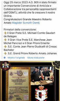 Relations with other Branches: Very Good. Friendship Agreement with OSMTJ-Mangum. Friendship Agreement with OSMTJ Mangum Grand Priory of France. Friendship Agreement with OSMTJ Mangum Grand Priory of Poland, Friendship Agreement with SOTI. Friendship Agreement with SOET.